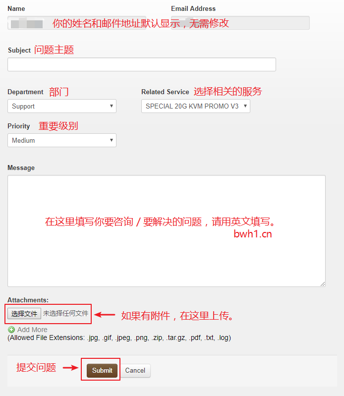 点击后会出现如下页面,需要填写姓名、邮箱地址、主题等相关信息。下面给出了填写指导。